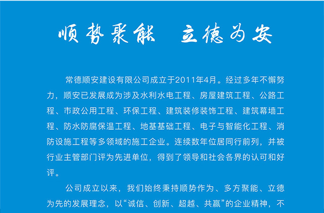 我們始終堅持“用戶至上、安全第一、質量第一、信譽第一”的宗旨。從歷史中吸取力量,從理想中獲取希望,以協作謀共贏、以務實固基礎、以奉獻筑品牌、以學習促轉型、以創先求突破,切實努力將順安公司打造成為人才素質高、技術實力優、社會聲譽好、競爭能力強的施工企業,竭誠與社會各界精誠合作,攜手開創順安輝煌的明天!
